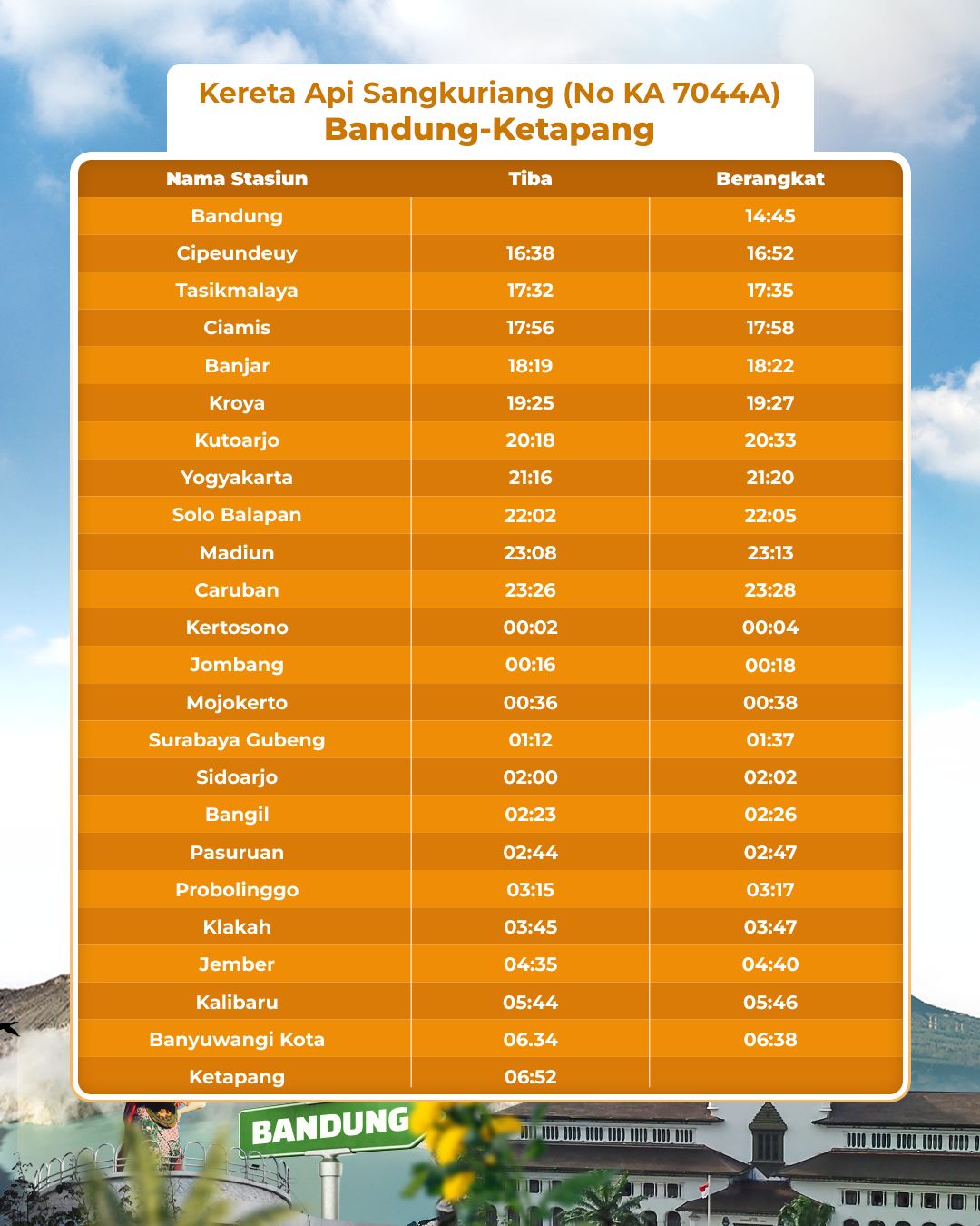 Tiket promo ini dapat diperoleh melalui aplikasi Access by KAI serta kanal penjualan resmi lainnya. Dalam perjalanannya, KA Sangkuriang akan melintasi sejumlah kota penting seperti Tasikmalaya, Ciamis, Yogyakarta, Solo, Madiun, Surabaya, hingga Jember sebelum tiba di Banyuwangi.