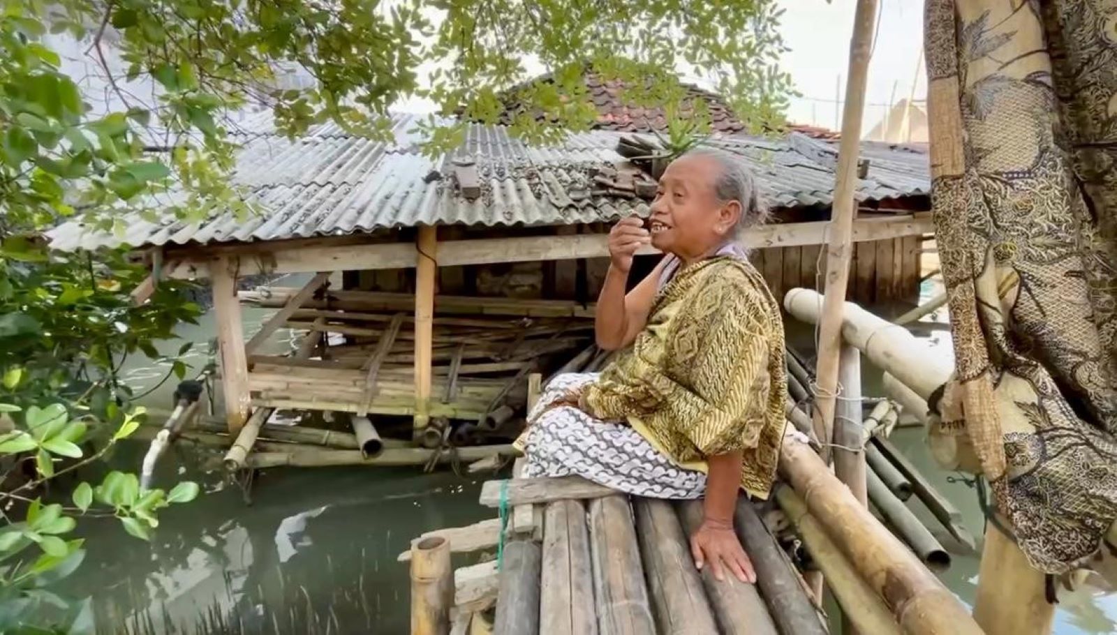 “Setiap hari ya begini. Sudah puluhan tahun saya menjalani hidup di sini. Tidur, makan, mandi ya di dalam. Hidupnya di atas air rob,” ungkap nenek yang menderita sakit punggung dan mata tersebut.