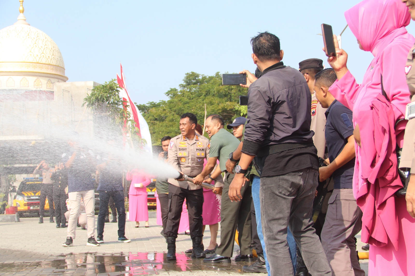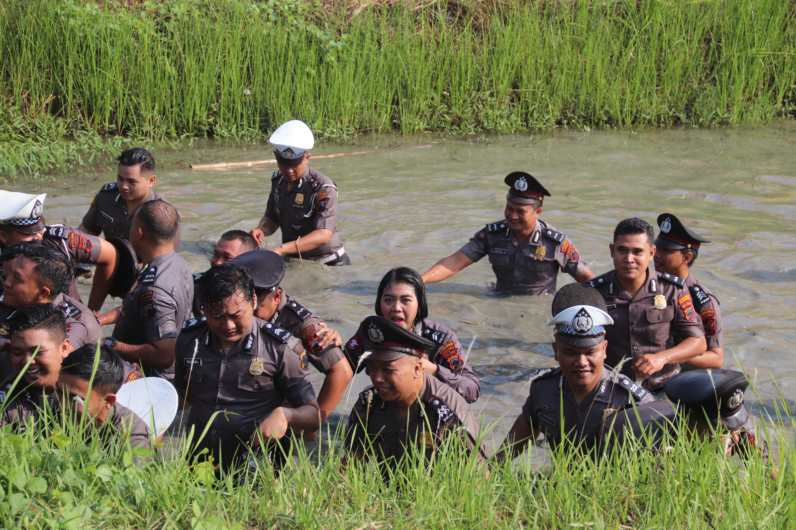 Tak hanya itu, mereka yang naik pangkat juga diperintahkan masuk ke kolam dan disemprot air oleh mobil Damkar dan AWC Polres Sukoharjo.