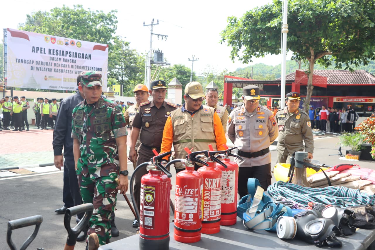 Apel ini sebagai bentuk kesiapan menghadapi potensi bencana alam di musim hujan. Apel dipimpin Kapolres Wonogiri AKBP Wahyu Sulistyo, SH, SIK, MPM dan dihadiri jajaran Forkopimda Wonogiri mulai dari Dandim 0728/Wonogiri Letkol Inf Edi Ristriyono, Wakil Bupati Imron Rizkyarno, hingga Kepala BPBD Fuad Wahyu Pratama.