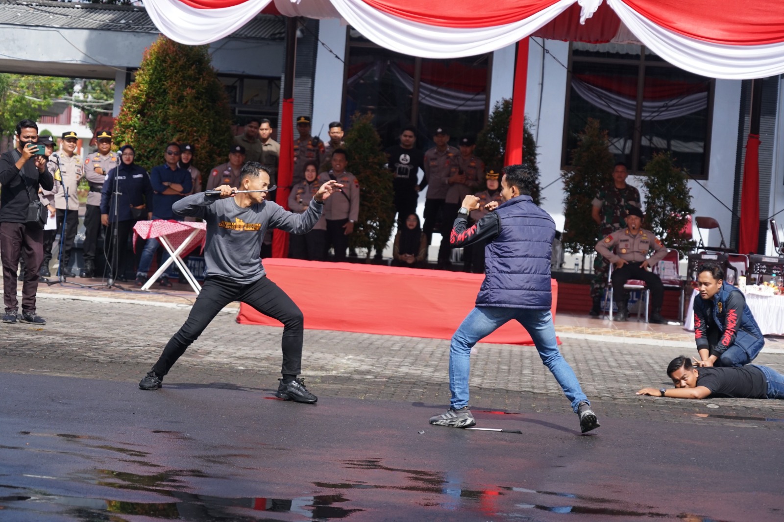 Dalam simulasi tersebut, diperagakan berbagai tahapan penanganan, mulai dari peran negosiator, Dalmas awal, hingga tindakan tegas terhadap pelaku kerusuhan.