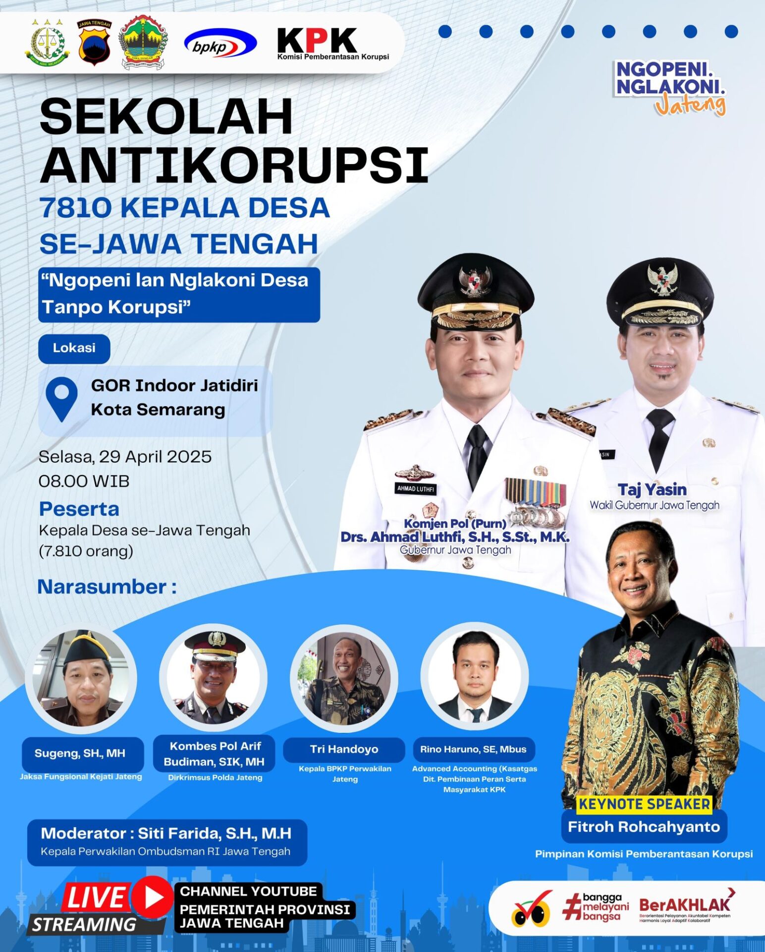 Sebagai pembicara kunci (keynote speaker) pada acara yang diinisiasi Gubernur Jateng itu adalah Pimpinan Komisi Pemberantasan Korupsi (KPK), Fitroh Rohcahyanto. Narasumber selanjutnya adalah Dirkrimsus Polda Jateng, Kombes Pol Arif Budiman, Kepala Badan Pengawasan Keuangan dan Pembangunan (BPKP) Perwakilan Jateng, Tri Handoyo dan Jaksa Fungsional Kejati Jateng, Sugeng.