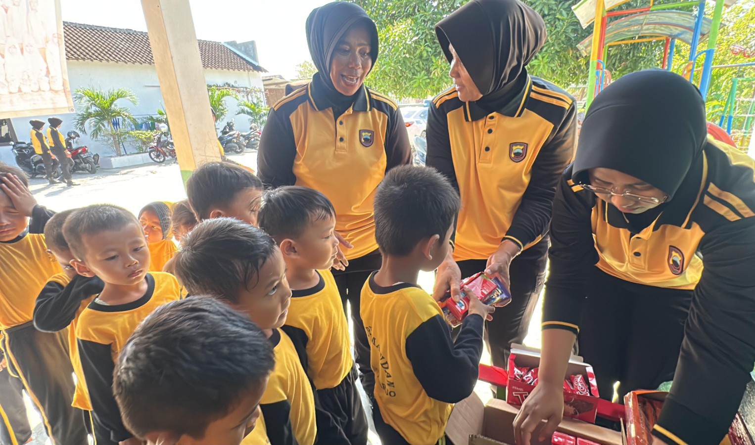 Dalam kesempatan itu, Polwan Polres Sukoharjo juga membagikan snack atau makanan dan minuman ringan kepada anak-anak sekolah.