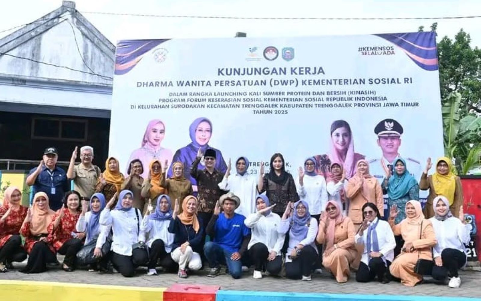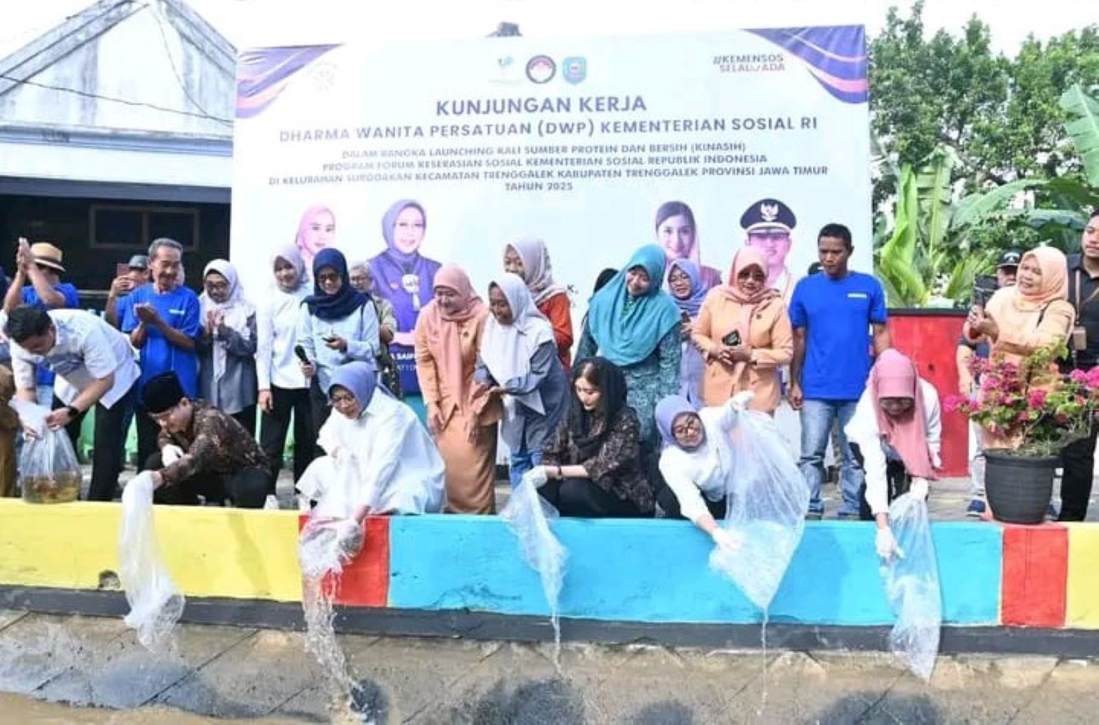 Portalika.com [TRENGGALEK, JAWA TIMUR] – Bupati Trenggalek Mochamad Nur Arifin beserta isteri Novita Hardini, SE, ME yang juga anggota DPR RI dari Dapil VII Jatim mengajak Fatma Saifullah Yusuf, Penasihat I Dharma Wanita Persatuan (DWP), Kementerian Sosial (Kemensos) tebar benih ikan nila di salah satu sungai di Kelurahan Surodakan, Senin, 23 Juni 2025.