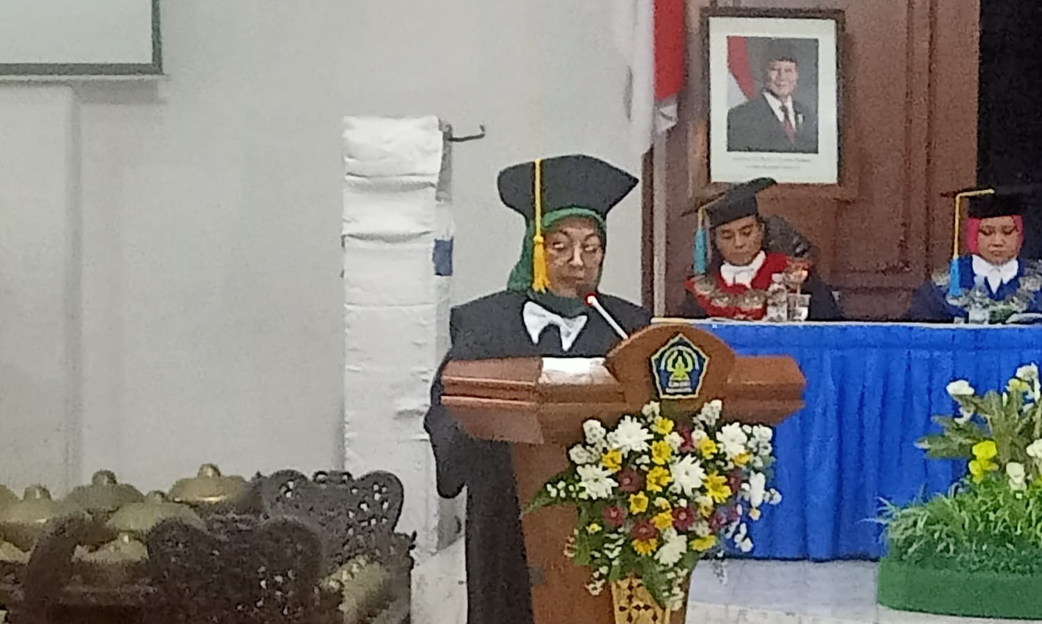 Prof Dr Ir Dewi Ratna Nurhayati, MP membacakan orasi ilmiahnya di Auditorium Unisri Solo, Jateng, Senin, 24 Februari 2025. (Portalika.com/Iskandar)