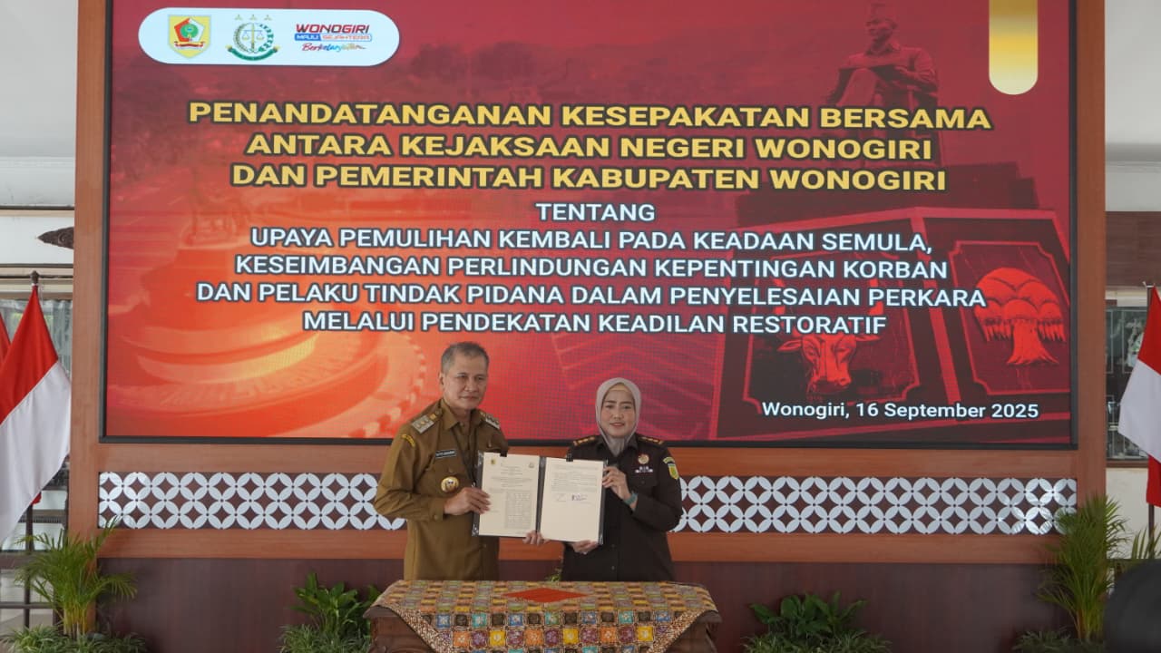 Portalika.com [WONOGIRI] – Pemerintah Kabupaten (Pemkab) Wonogiri dan Kejaksaan Negeri Wonogiri menandatangani kesepakatan bersama upaya mewujudkan penegakan hukum yang lebih humanis dan berorientasi pada pemulihan pihak berperkara berupa keadilan restorastif di Pendopo Kabupaten Wonogiri, Selasa, 16 September 2025.