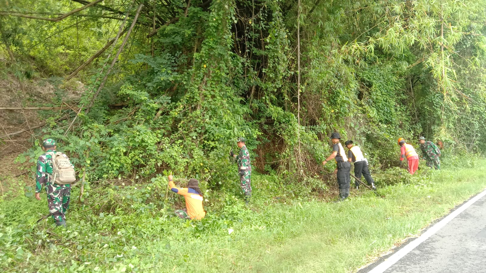 Portalika.com [WONOGIRI] – Komandan Koramil 04/Nguntoronadi Kodim 0728/Wonogiri, Kapten Inf Agus Priyanto beserta anggotanya berbaur bersama relawan dari Comandan, Relawan MTA, Tagana, SAR Unit Baturetno Wonogiri, PMI dan masyarakat menebang ranting pohon yang sudah tua dan membahayakan keselamatan pengguna jalan, di jalan antar provinsi tepatnya di area Gunung Pegat, Desa Bumiharjo, Kecamatan Nguntoronadi, Kabupaten Wonogiri, Rabu, 12 November 2025.