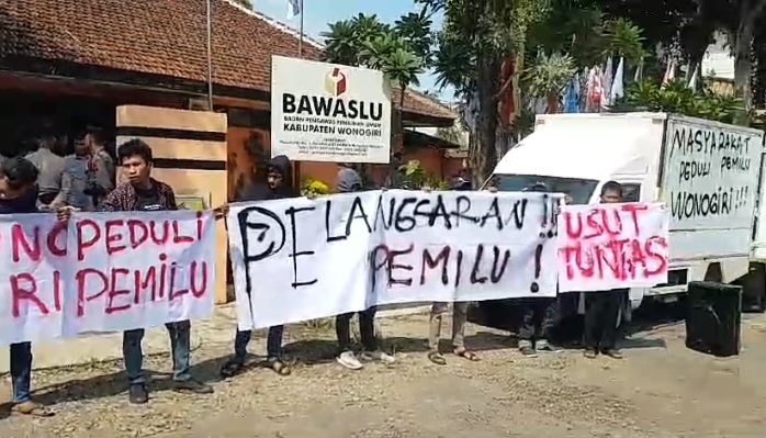 Pelanggaran pemilu diduga melibatkan Ketua Panitia Pemilihan Kecamatan (PPK) Wonogiri, HRB, 49 yang berawal dari temuan ganja. Koordinator MP2W, Gunarto mengatakan demo warga sebagai bentuk pengawalan warga terhadap tahapan Pemilu.