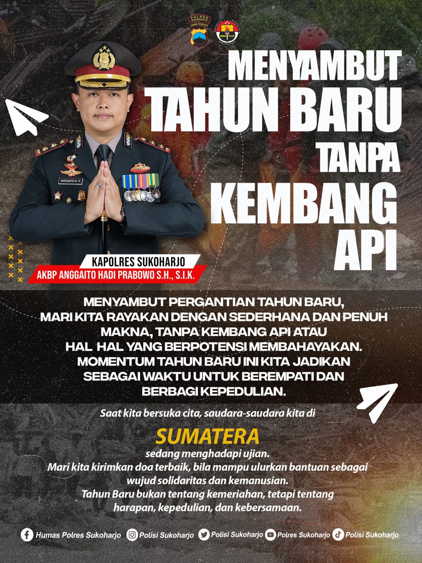 “Tahun Baru bukan soal kemeriahan semata, tetapi tentang harapan, kebersamaan, dan kepedulian. Mari kita sambut dengan bijak demi Sukoharjo yang aman dan kondusif,” ujarnya. (Triantotus/*)