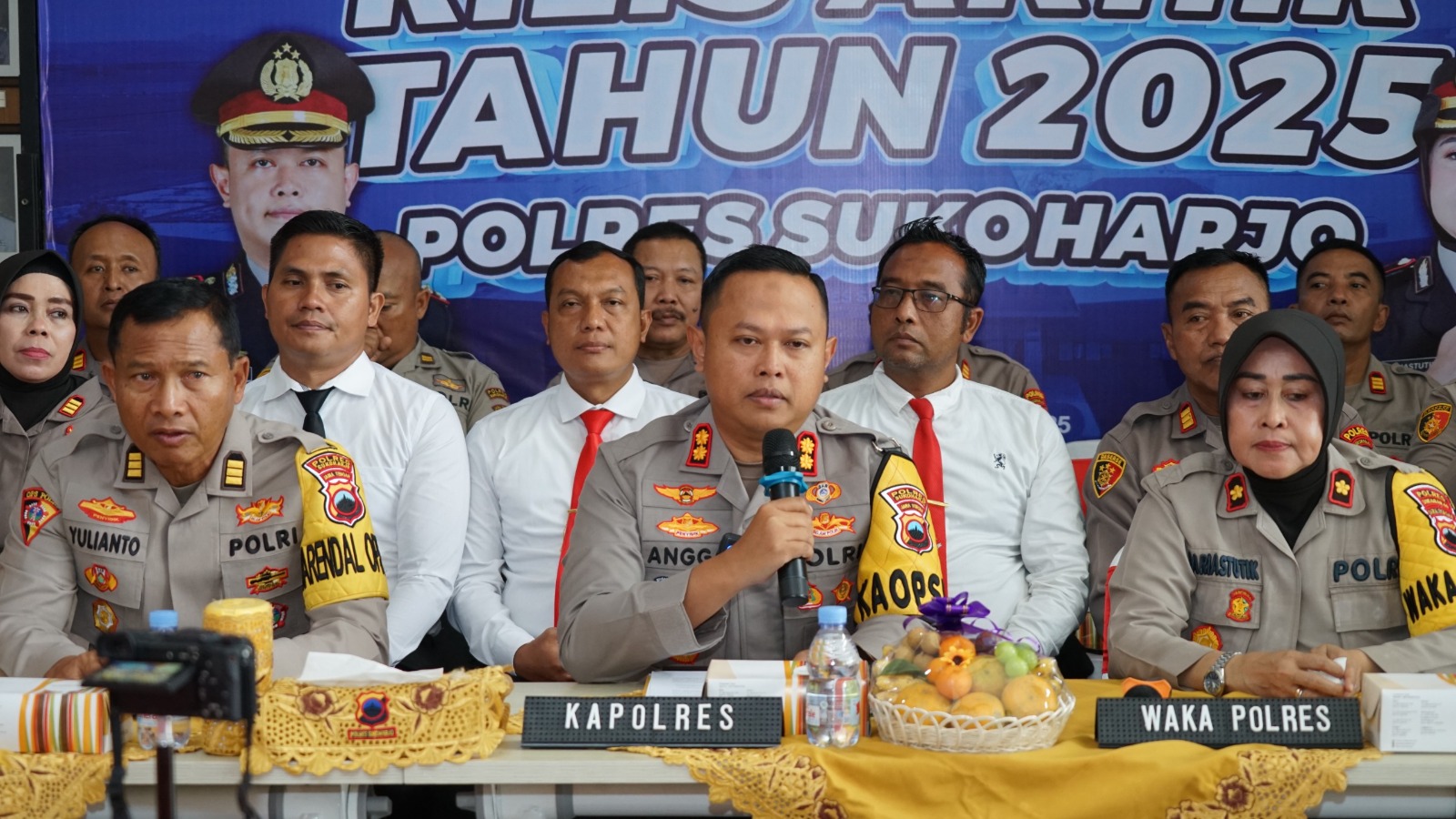 Press release dipimpin Kapolres Sukoharjo, AKBP Anggaito Hadi Prabowo, didampingi Wakapolres Kompol Pariastutik. Kapolres Sukoharjo menyampaikan apresiasi dan terima kasih kepada seluruh masyarakat Kabupaten Sukoharjo, TNI, pemerintah daerah, serta seluruh pemangku kepentingan atas dukungan dan sinergi yang terjalin selama ini sehingga situasi kamtibmas di wilayah hukum Polres Sukoharjo tetap terjaga dengan baik.