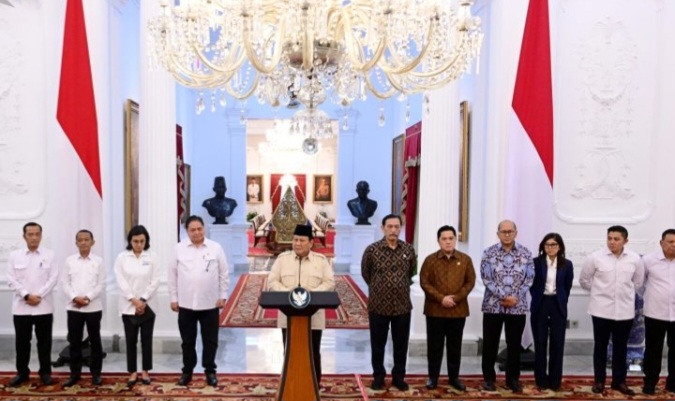 Mendampingi Presiden Prabowo dalam konferensi pers tersebut adalah Menteri Koordinator Bidang Perekonomian, Airlangga Hartarto, Menteri Sekretaris Negara, Prasetyo Hadi, Menteri Keuangan, Sri Mulyani, Menteri ESDM, Bahlil Lahadalia, Menteri Badan Usaha Milik Negara, Erick Thohir, Menteri Investasi dan Hilirisasi/Kepala BKPM Rosan Roeslani, Menteri Komunikasi dan Digital Meutya Hafid, Sekretaris Kabinet Teddy Indra Wijaya, Ketua DEN Luhut Binsar Pandjaitan, dan Wakil Menteri Sekretaris Negara Bambang Eko Suhariyanto. (BPMI Setpres)