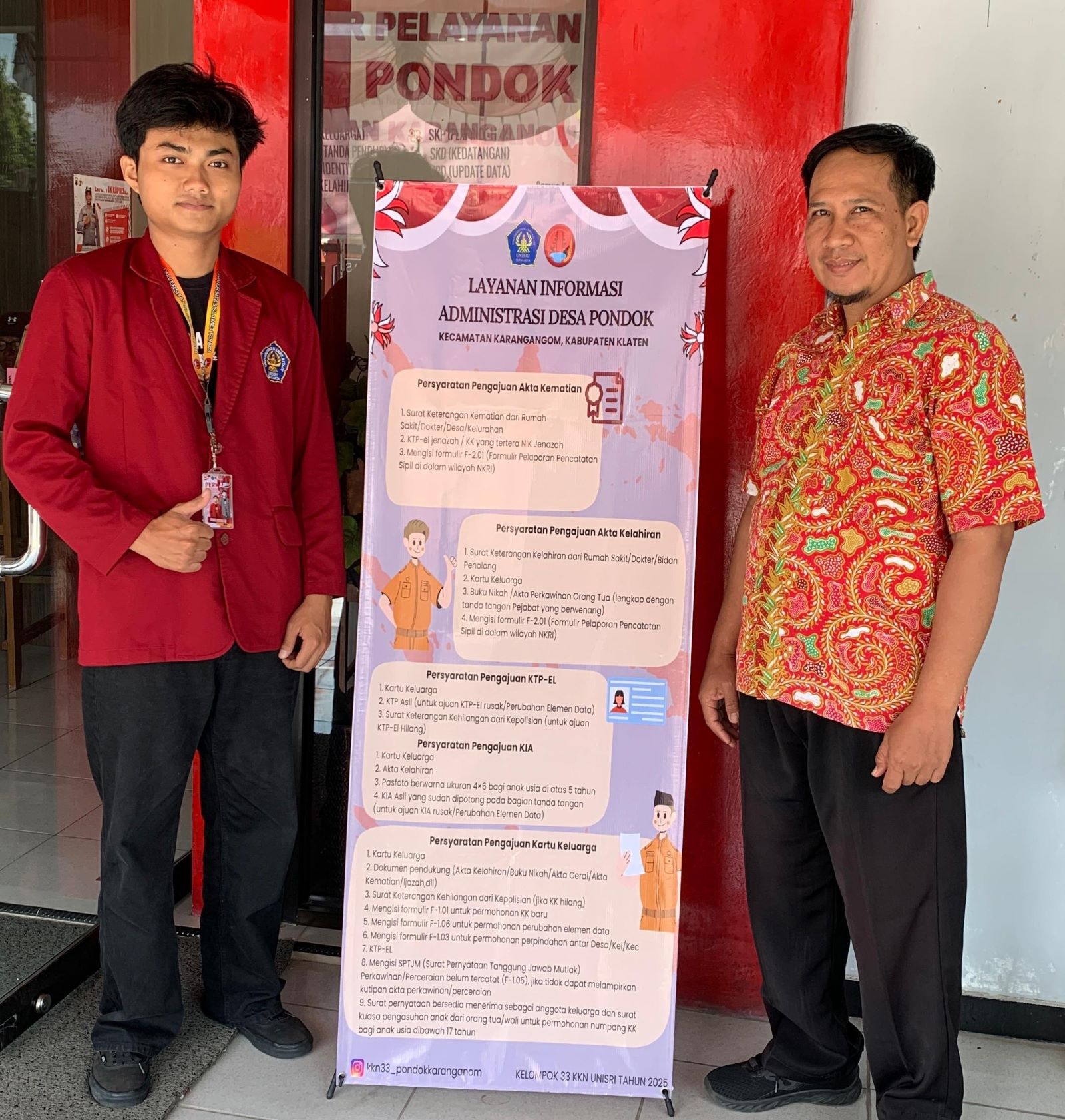 Mahasiswa KKN PPM Unisri Surakarta Tahun 2025 Kelompok 33 , Bima Andika Mukti melalui program kerja individu Pembuatan Stand Banner Terkait Pengembangan Informasi Layanan Administrasi Desa Pondok, Kecamatan Karanganom, Kabupaten Klaten.