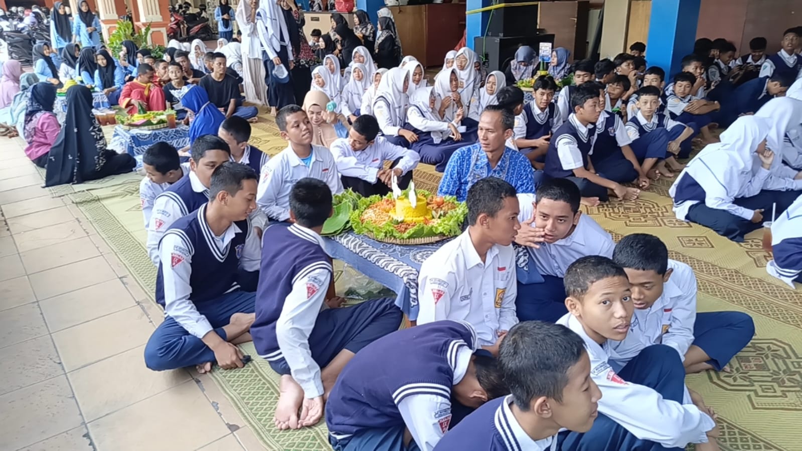 Acara bacakan tumpengan massal diadakan di halaman sekolah, di mana siswa dan siswi berkumpul untuk menyantap nasi tumpeng yang telah disiapkan.