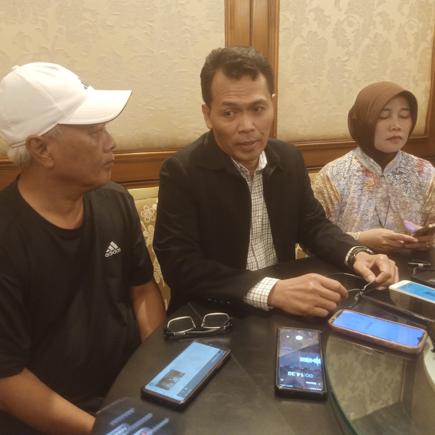 Kuasa hukum para caleg dari Klaten, Karanganyar dan Sukoharjo, Sri Sumanta (tengah) memberi keterangan kepada para wartawan di Restoran Diamond Solo, Jateng, Kamis 28 Maret 2024 malam. (Portalika.com/Iskandar)