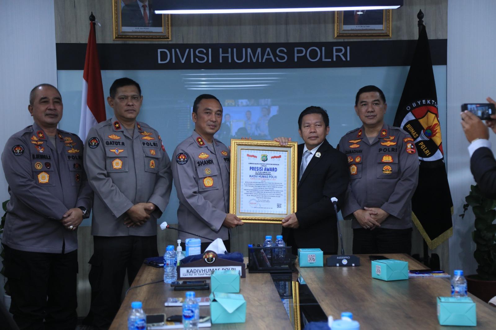 Portalika.com [JAKARTA] – Lembaga Kajian Strategi Kepolisian Indonesia (Lemkapi) memberikan apresiasi dan penghargaan Presisi Award kepada Kepala Divisi Humas Polri, Irjen Pol Sandi Nugroho. Penghargaan diberikan atas loyalitasnya bersama staf Divisi Humas Polri dan Bidhumas Polda Jajaran dalam menjalin komunikasi publik yang baik.