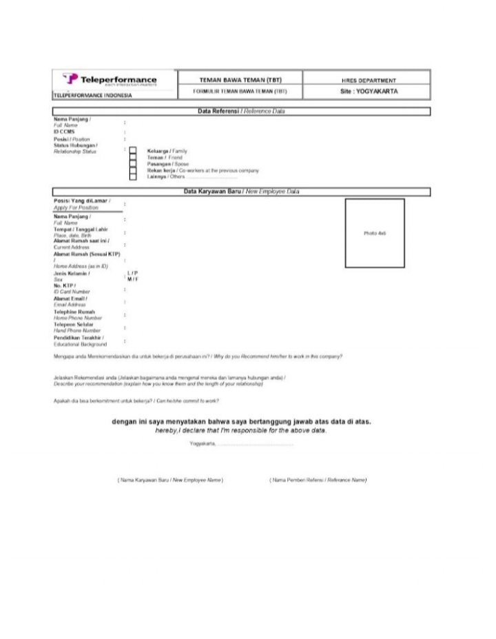 Teman bawa teman (TBT) adalah salah satu jalur rekruitmen yang dapat ditempuh pelamar pekerjaan yaitu dengan rekomendasi yang dibawa oleh teman yang bekerja di Teleperformance. Sehingga teman yang sudah bekerja di Teleperformance dapat membantu mendaftarkan dengan rekomendasi yang sesuai kriteria yang diinginkan Perusahaan.