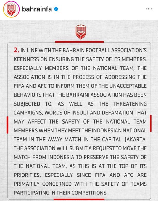 Portalika.com [JAKARTA] – Dalam pernyataan resmi yang diunggah di Instagram @bahrainfa, Federasi Sepak Bola Bahrain menyatakan ketidakpuasan dan kekhawatiran terkait keamanan timnas mereka saat bertanding melawan Indonesia di Stadion Gelora Bung Karno (GBK). Setelah hasil imbang 2-2 dalam pertandingan sebelumnya pada 10 Oktober 2024, federasi tersebut meminta kepada AFC dan FIFA untuk memindahkan laga lanjutan Kualifikasi Piala Dunia 2026 zona Asia dari Indonesia.